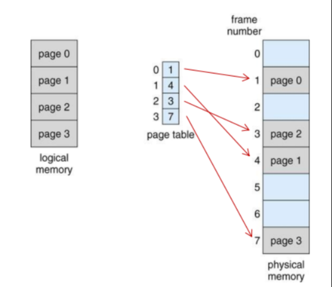 따라서 프로세스가 비록 물리메모리에는 불연속적으로 배치되어 있더라도 논리 주소에는 연속적으로 배치되도록 페잊 ㅣ테이블을 이용한다.