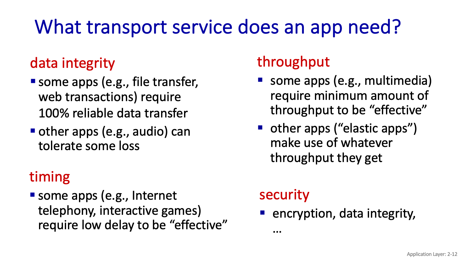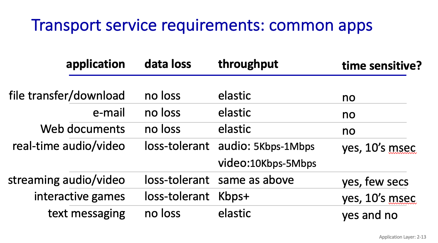 file transfer/download 는 loss 가 없어야하고,throughput 이 elastic(왔다 갔다함,,) 하다 한다..time sensitive는 시간 을 보장..?