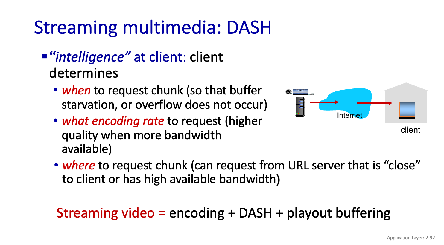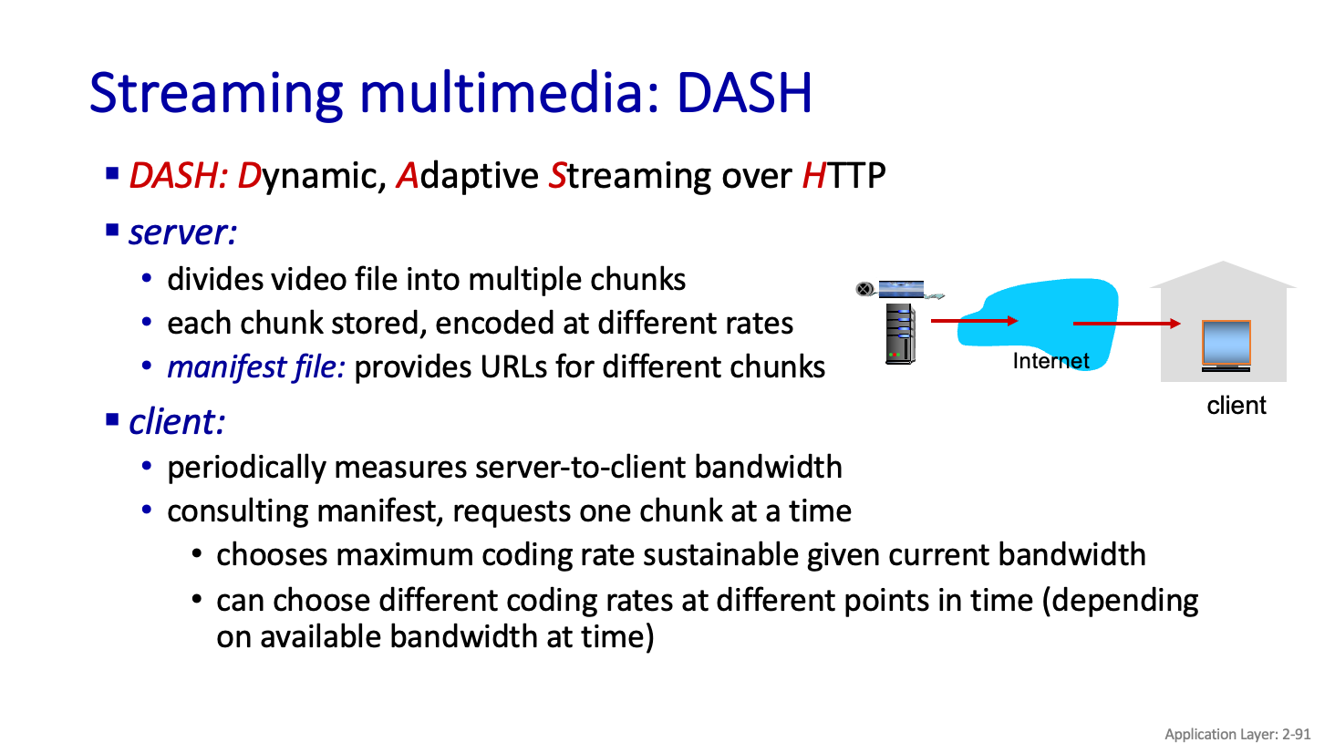 DASH 는 Http 도 request,response로 Video 를 Mutiple chunk 로 나눈다. 그리고 chunk 별로 다른 rate 로 인코딩이 되어있다.