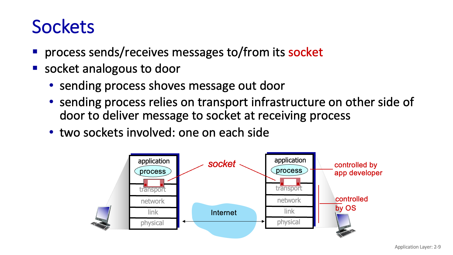 계층을 거쳐서 내가 보낸 Data 가 상대방까지 잘 가고 그 Data가 process 까지 잘 전달 될수있도록 해준다. 이것을 Socket 을 사용해서 Socket 이 Process 간 통신을 하게 해준다.