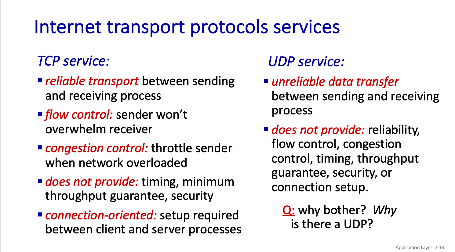 이런데 UDP 를 쓰는 이유는 UDP 같은 Service 를 더 선호하는 응용이 있을수 있기 떄문이다. 빨리 Data 를 보내야하는데 순서 안맞았다고 안보내는 TCP 와는 다르게 그냥 뭐 조금 손실이나 delay 있더라도 UDP 는 그냥 보내버리기 때문에 이런 Service를 원하는 응용이 있을수 있다.