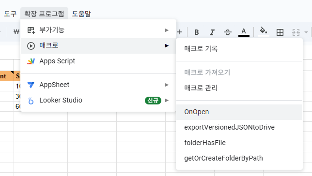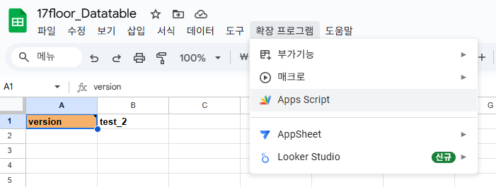 구글 스프레드시트 > 확장 프로그램 > Apps Script 선택