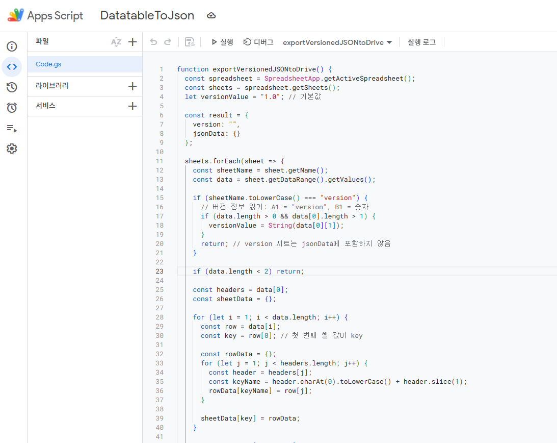 나타난 Apps Script 창에 gs 파일을 추가해 메서드를 직접 코딩하면 된다.