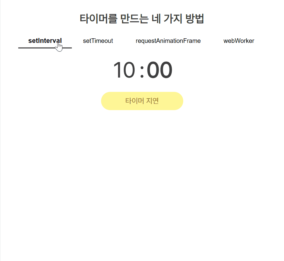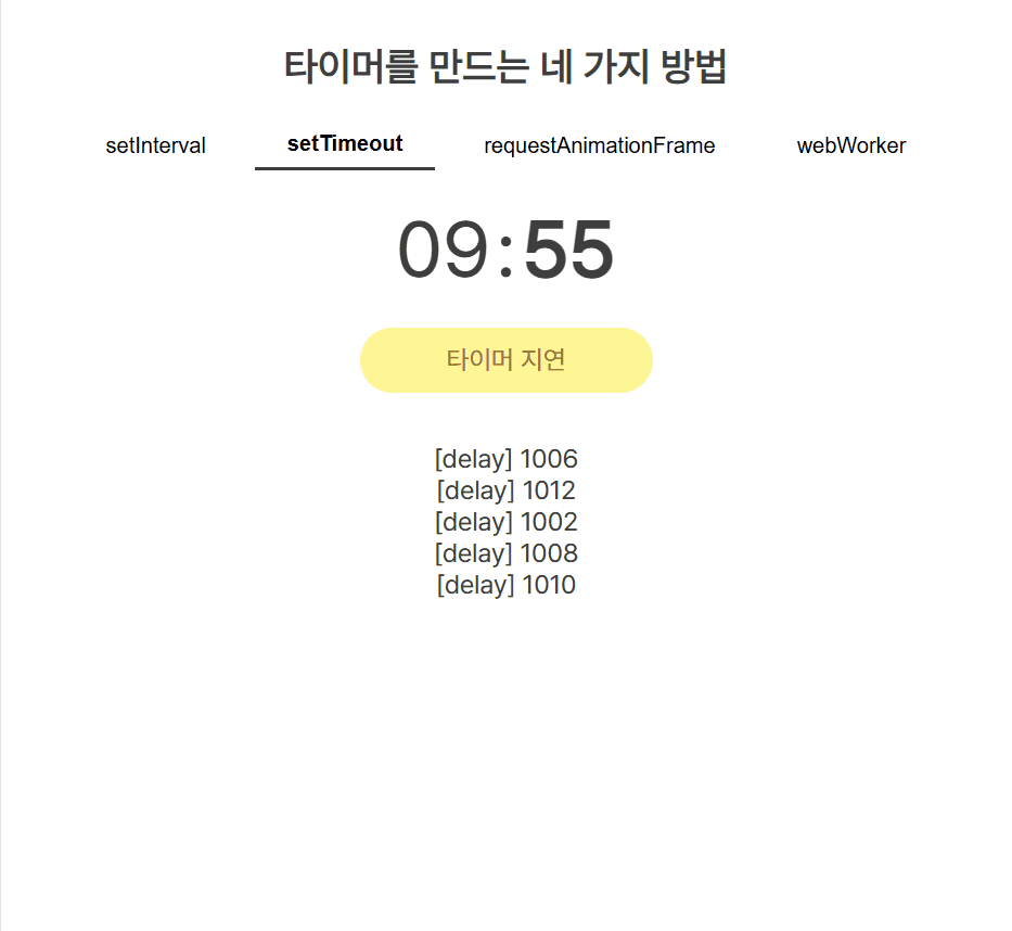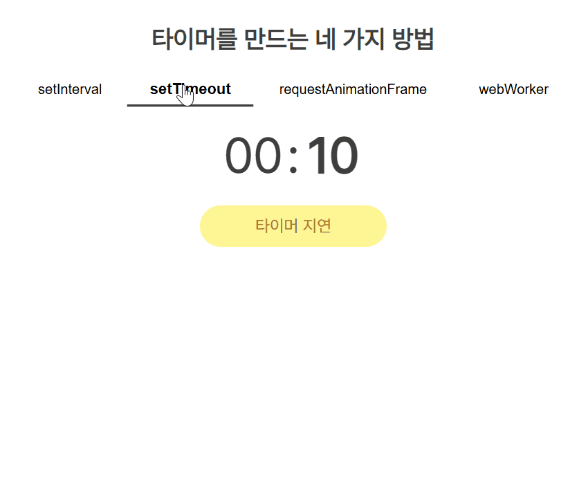 으로 타이머를 구현하면 정확한 시간 측정이 어렵고, 타이머로서의 신뢰성이 떨어지게 된다. 따라서 정확한 타이머 구현을 위해서는 setTimeout보다는 setInterval