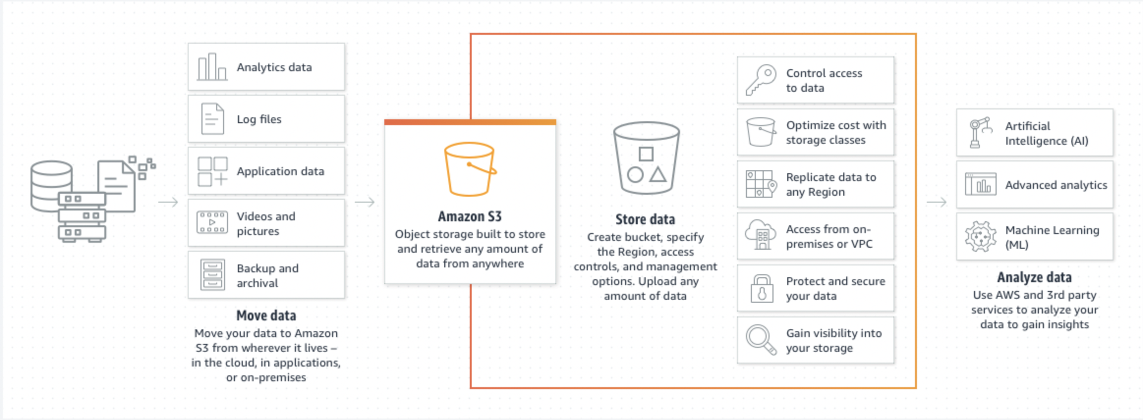 : 사진, 동영상, 기계 학습(ML), 센서 데이터, 오디오 파일, 다른 유형의 웹 콘텐츠 등 갈수록 증가하는 비정형 데이터를 저장해야 함 -> 이러한 데이터를 저장할 확장 가능하고 효율적이며 경제적인 방법 / 비정형 데이터의 대규모 스토어를 구축하기 위한 데이터 스토리지