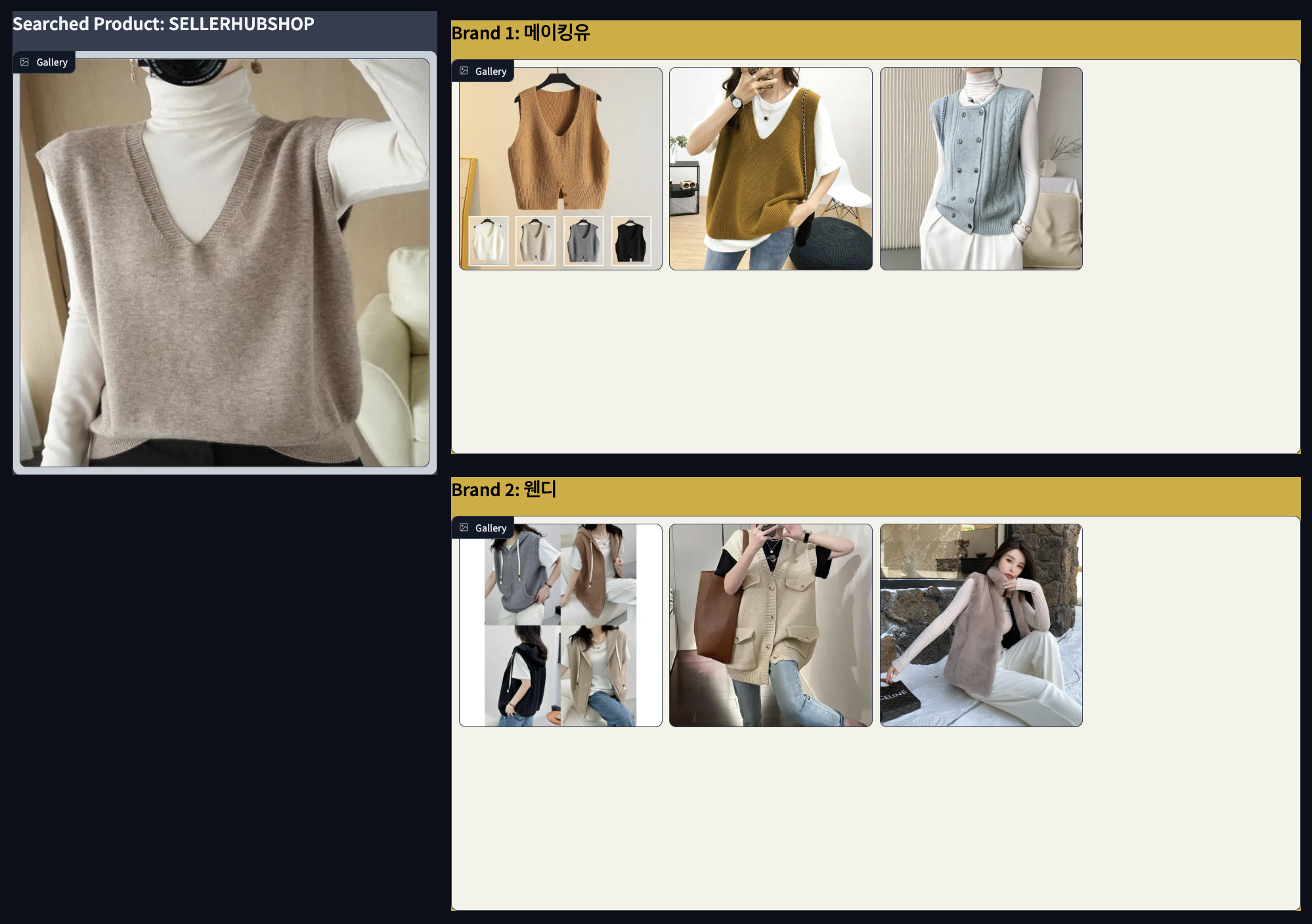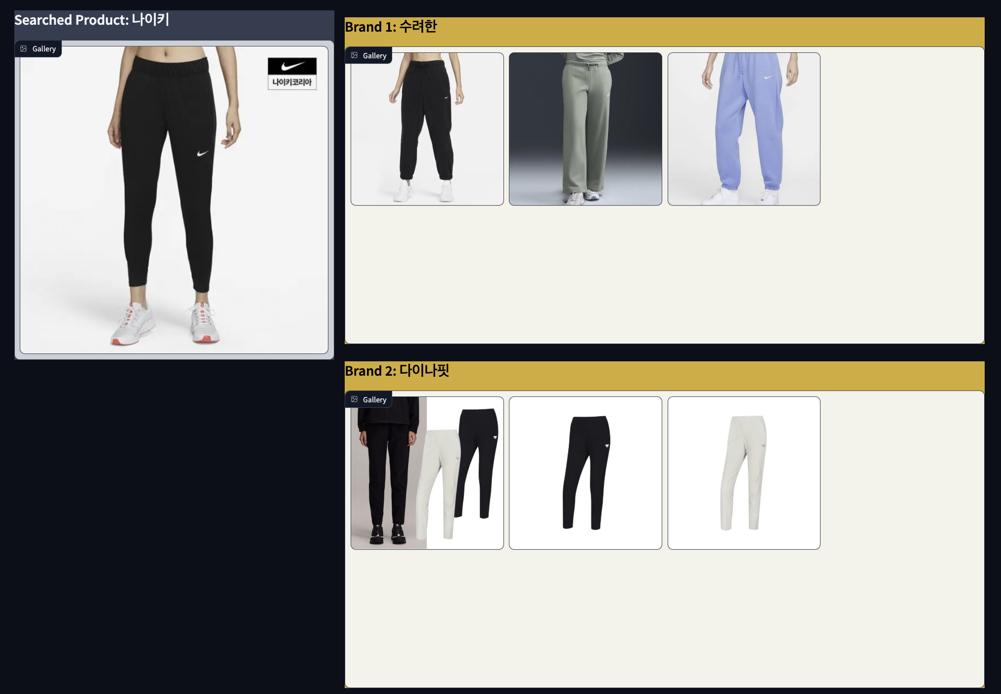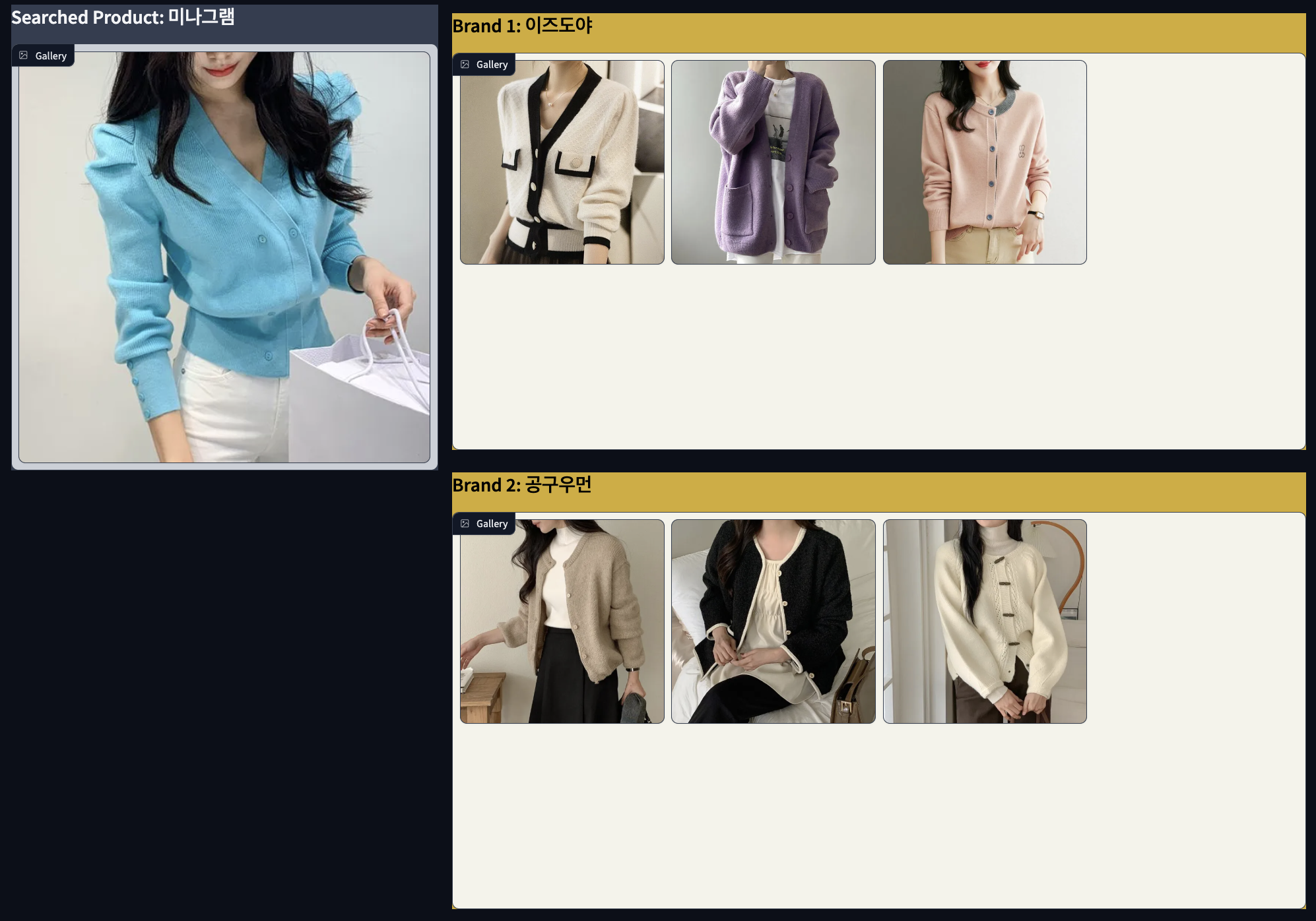 각 브랜드에서 왼쪽 사진과 가장 유사한 제품 3개씩 뽑아낸 결과입니다.