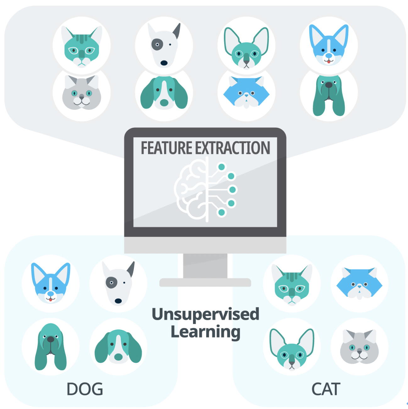 아래처럼 다양한 동물의 사진이 주어졌을 때, 해당 동물의 라벨은 주어지지 않는다. 비지도 학습은 동물 사진에서 유사한 패턴이나 특징을 분석하여 데이터를 군집화한다. 학습이 끝난 뒤에 새로운 개 사진을 주면 모델은 기존 군집 중 어느 군집에 속할 가능성이 높은지 판단한다。