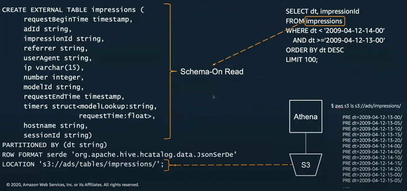 - S3에 이미 저장된 데이터를 해석하는 방법을 정의=> 읽을 때 스키마를 정의(Schema-on-read)