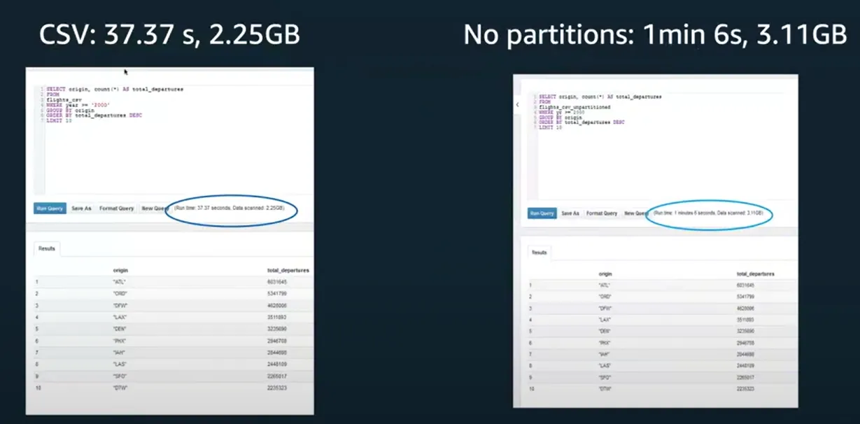 Where year>=2000 : 파티셔닝을 하게 되면 Athena에서는 2000년 이전의 데이터를 아예 보지 않음