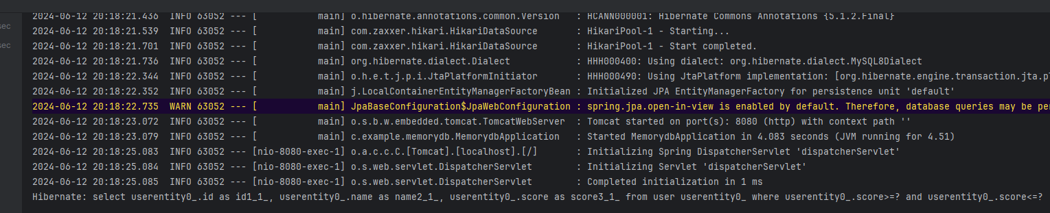 성공적으로 응답을 내렸고, 실행로그 하단에 쿼리문이 출력된 것을 볼 수 있다.
