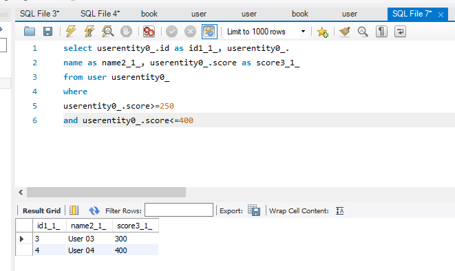 현재 user 테이블의 전체 데이터는 다음과 같고, 250 <= score <= 400의 데이터를 추출하도록 해보자