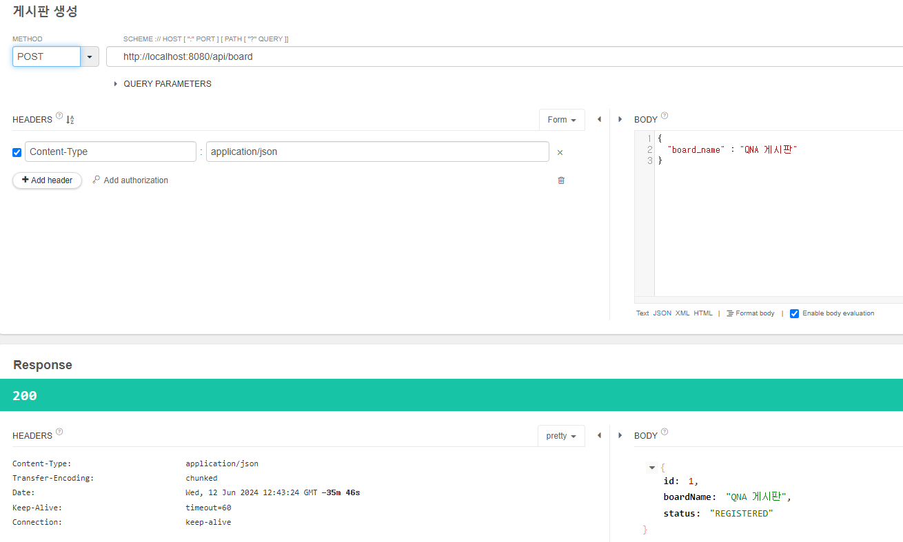 board 테이블에 추가할 것은 게시판 이름 뿐이므로 request는 boardName만 작성한다.