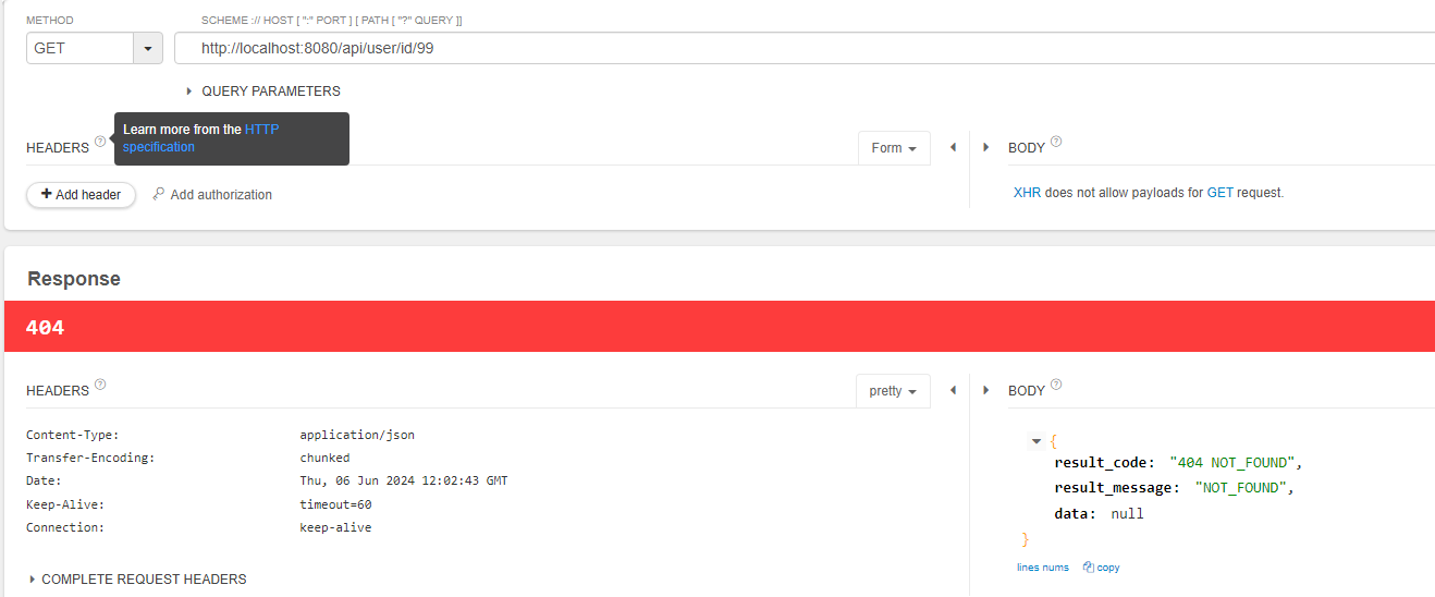 response 자체도 404코드와 함께 body에 메세지까지 잘 내려갔다.