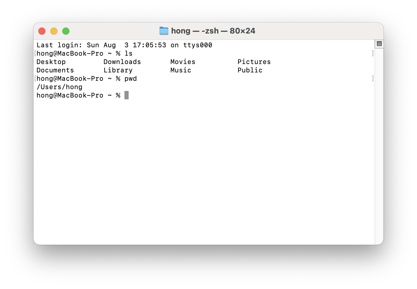 아래 예시 이미지와 같이 맥북에서 터미널을 실행할 수 있고, 명령어를 입력하면 컴퓨터는 명령어를 실행하고 결과를 보여줍니다.