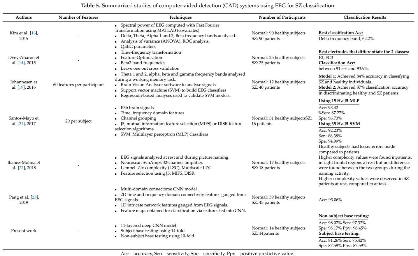 조현병 관련 연구들이 table 5에 적혀 있습니다. 전처리 방법과 사용한 모델 그리고 정확도까지 표에 나와있습니다.