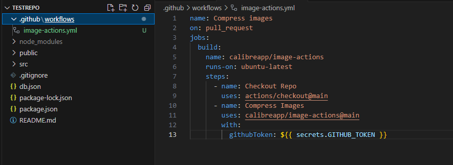 다음과 같이 프로젝트 파일 안에 꼭 .github/workflows/calibreapp-image-actions.yml이라는 파일을 생성해준다.