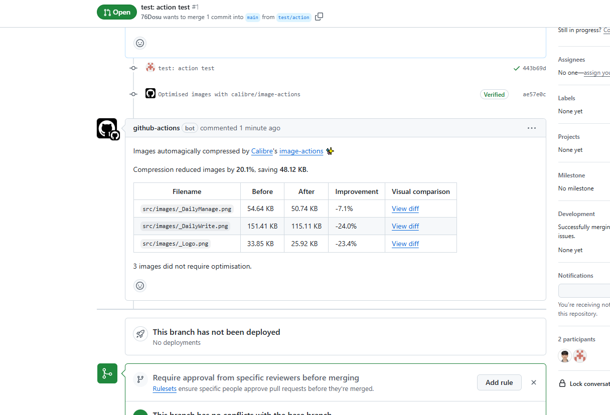 이후에 이미지를 추가한 후에 PR을 날리면 자동으로 압축이 진행된다. 압축을 진행하면 액션봇이 얼마나 줄여졌는지 친절하게 알려준다.