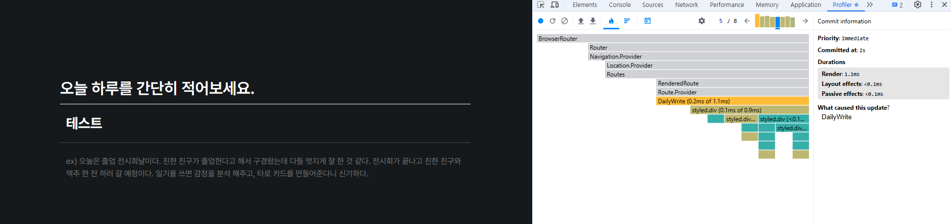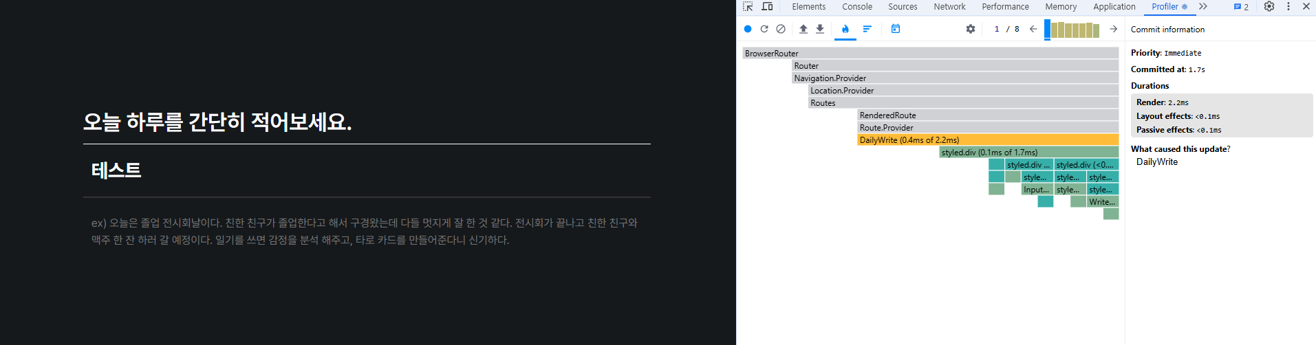 프로파일러를 통해 input에 텍스트를 입력하는 렌더링 과정을 살펴보면 매번 입력할 때 마다 전체 input이 아닌 DailyWrite 전체가 렌더링된다.
