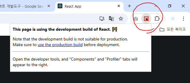 빨간 로고 모양 : 리액트가 개발자 모드로 실행되고있다.