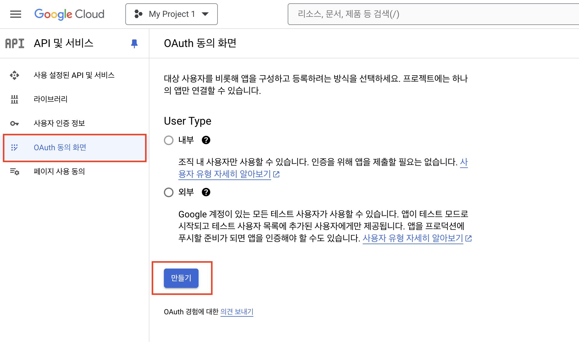 OAuth 동의 화면 이동 후 만들기를 클릭합니다.