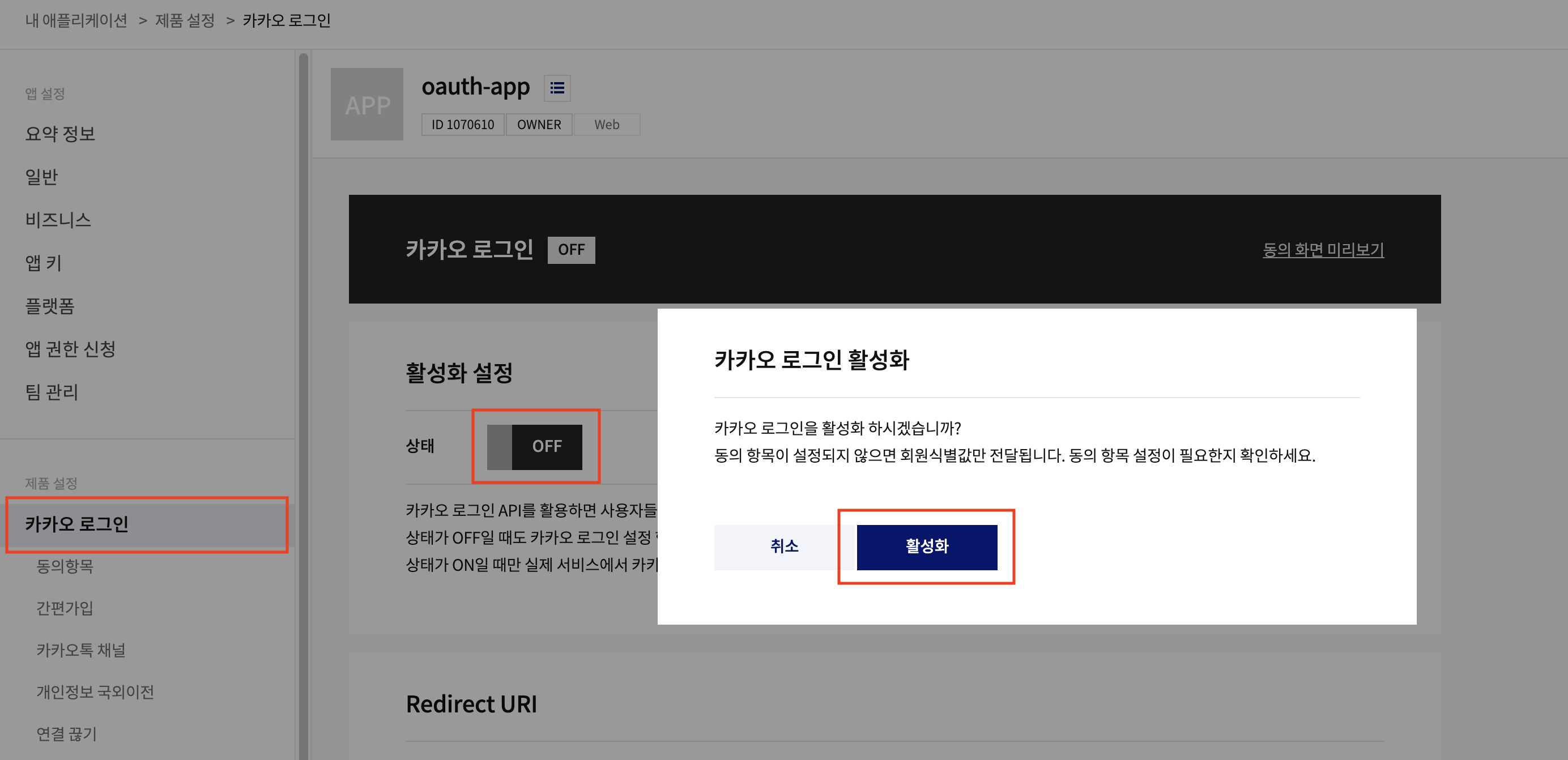 카카오 로그인 활성화를 위해 제품 설정 > 카카오 로그인 > 활성화 설정 상태 off버튼 클릭 > 활성화 버튼 클릭 하여 활성화 상태를 on으로 바꿔줍니다.