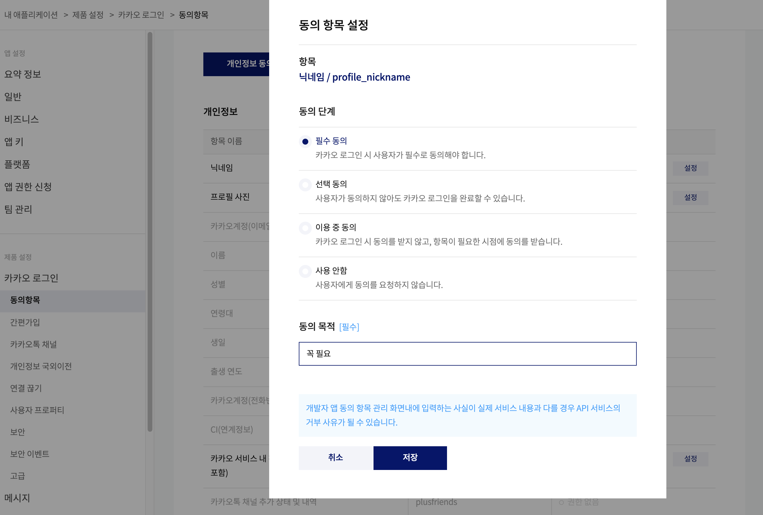 해당하는 항목에 설정버튼을 클릭하여 동의 단계와 동의 목적을 입력 후 저장합니다.