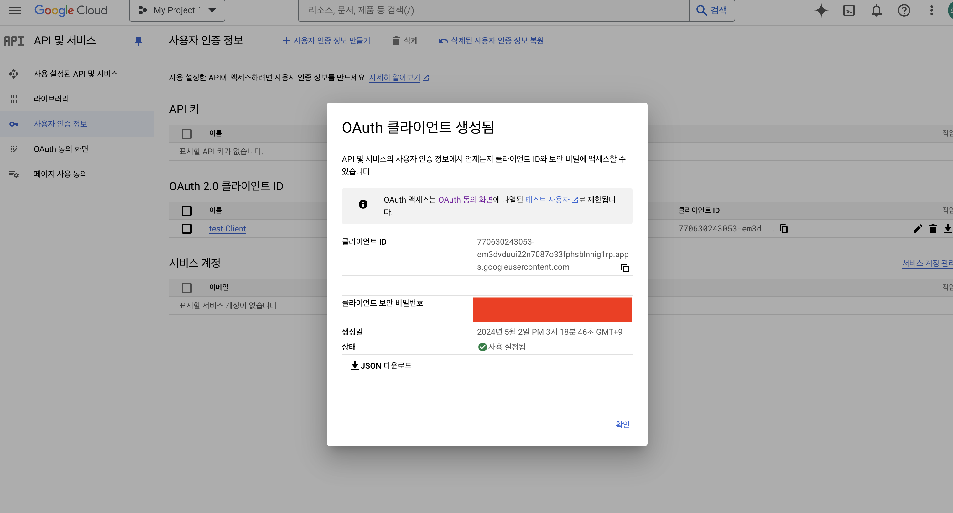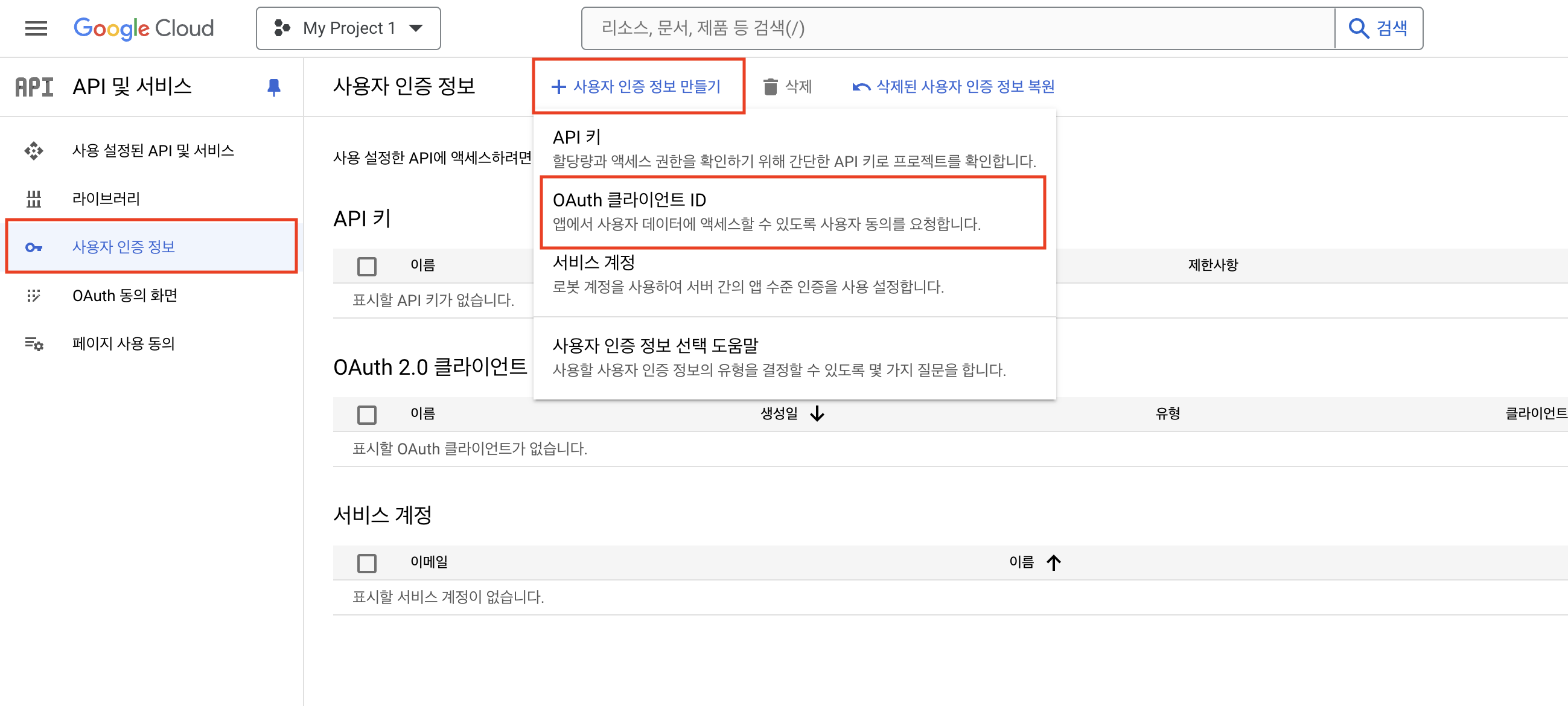 완료되면 사용자 인증 정보 > 사용자 인증 정보 만들기 > OAuth 클라이언트 ID 를 클릭하여 이동합니다.