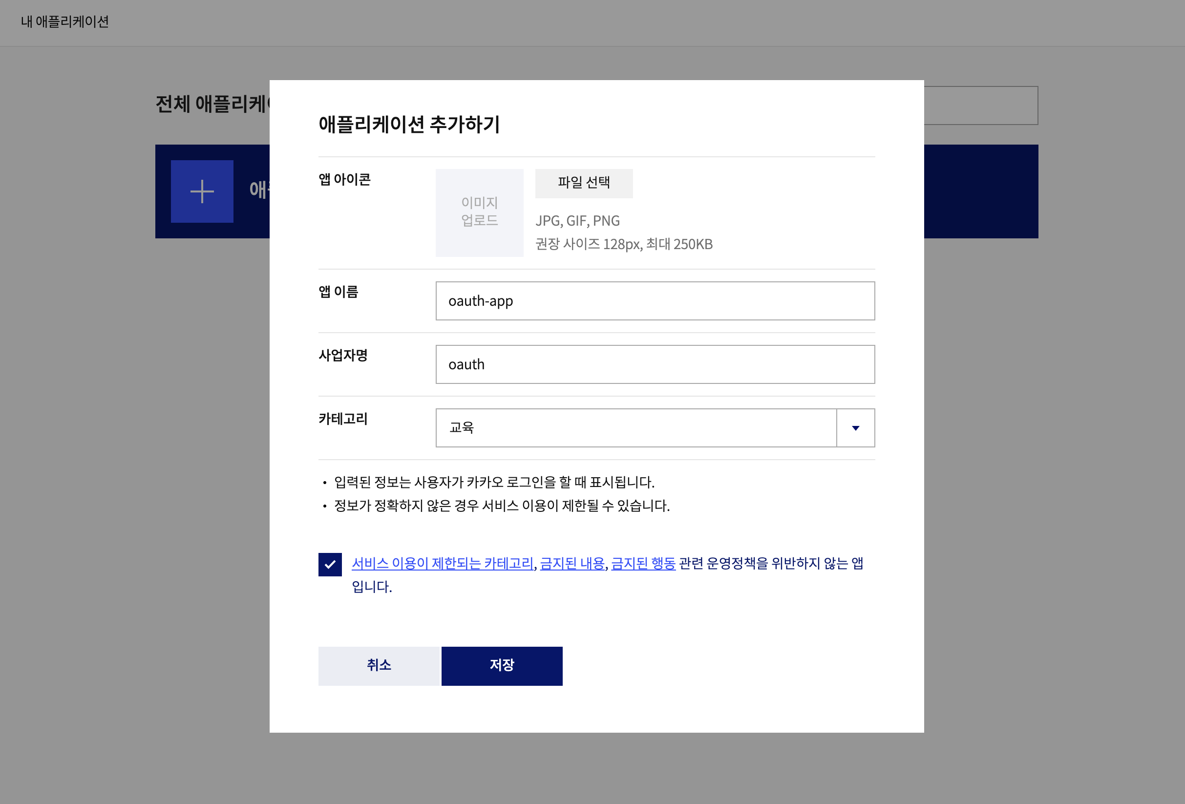 앱 이름, 사업자명, 카테고리 입력 후 동의하고 저장하면 됩니다.