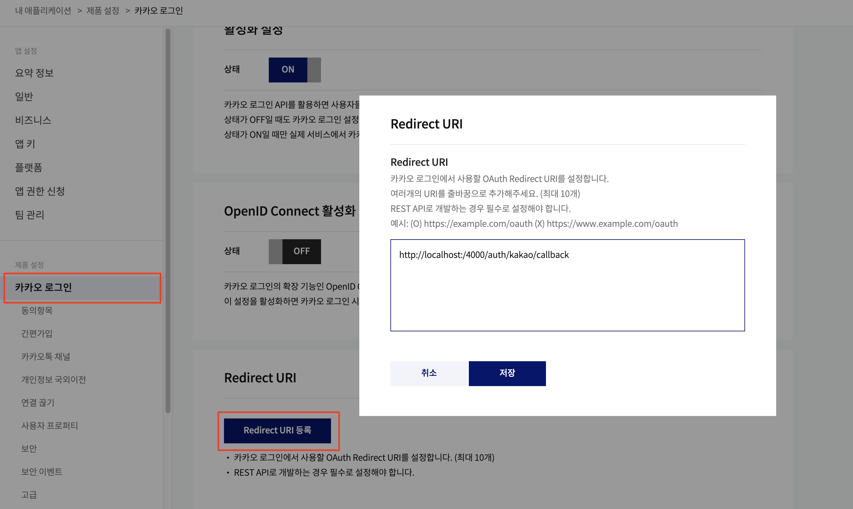 Redirect URI 입력 후 저장합니다.