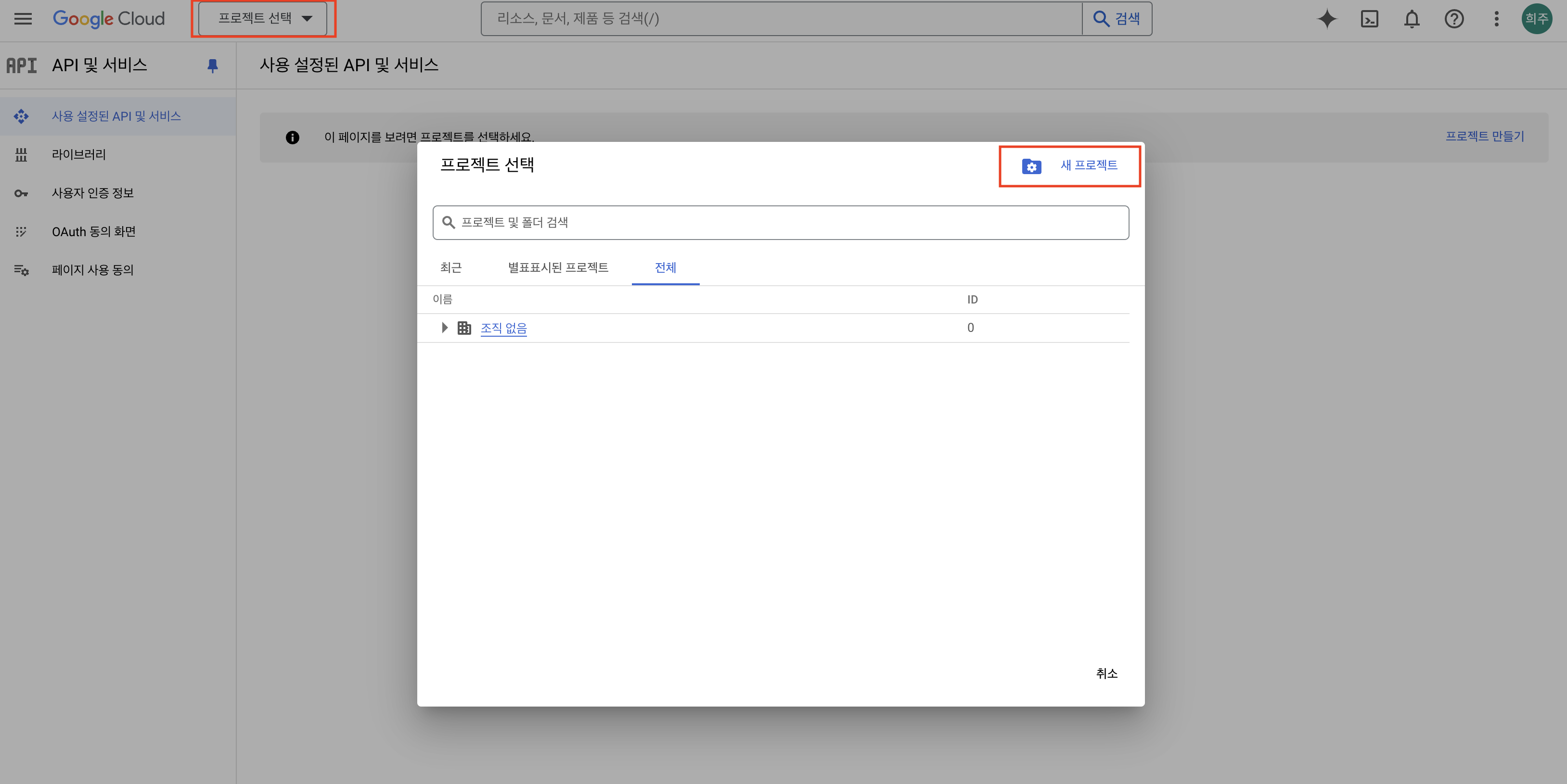 프로젝트 생성을 위해 왼쪽 상단에 프로젝트 선택 클릭 후 새 프로젝트를 클릭합니다.