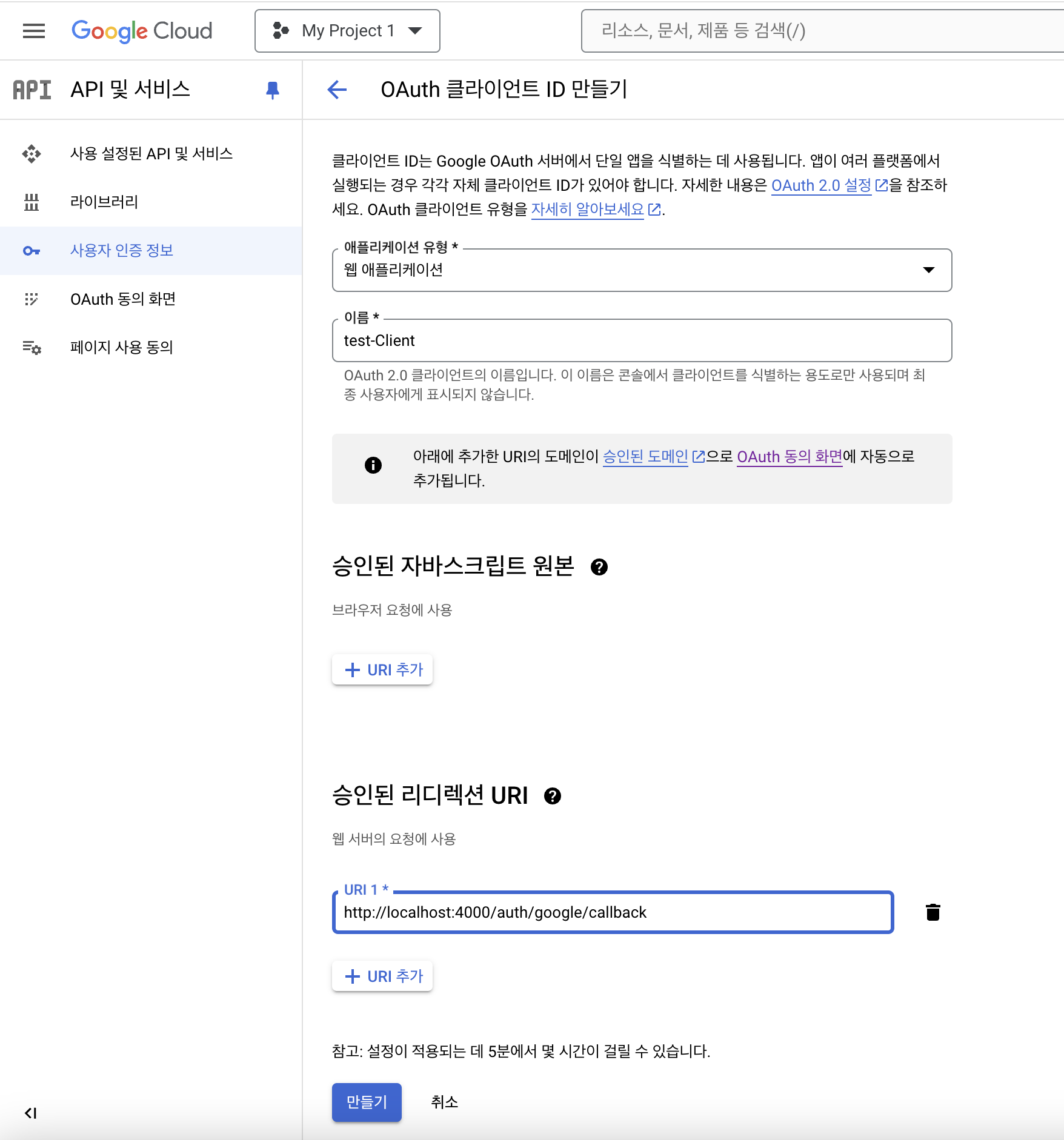 애플리케이션 유형, 이름 , 승인된 자바스크립트 원본 ,승인된 리디렉션 URI 항목에 맞는 내용을 입력해 준 뒤 만들기를 클릭합니다.