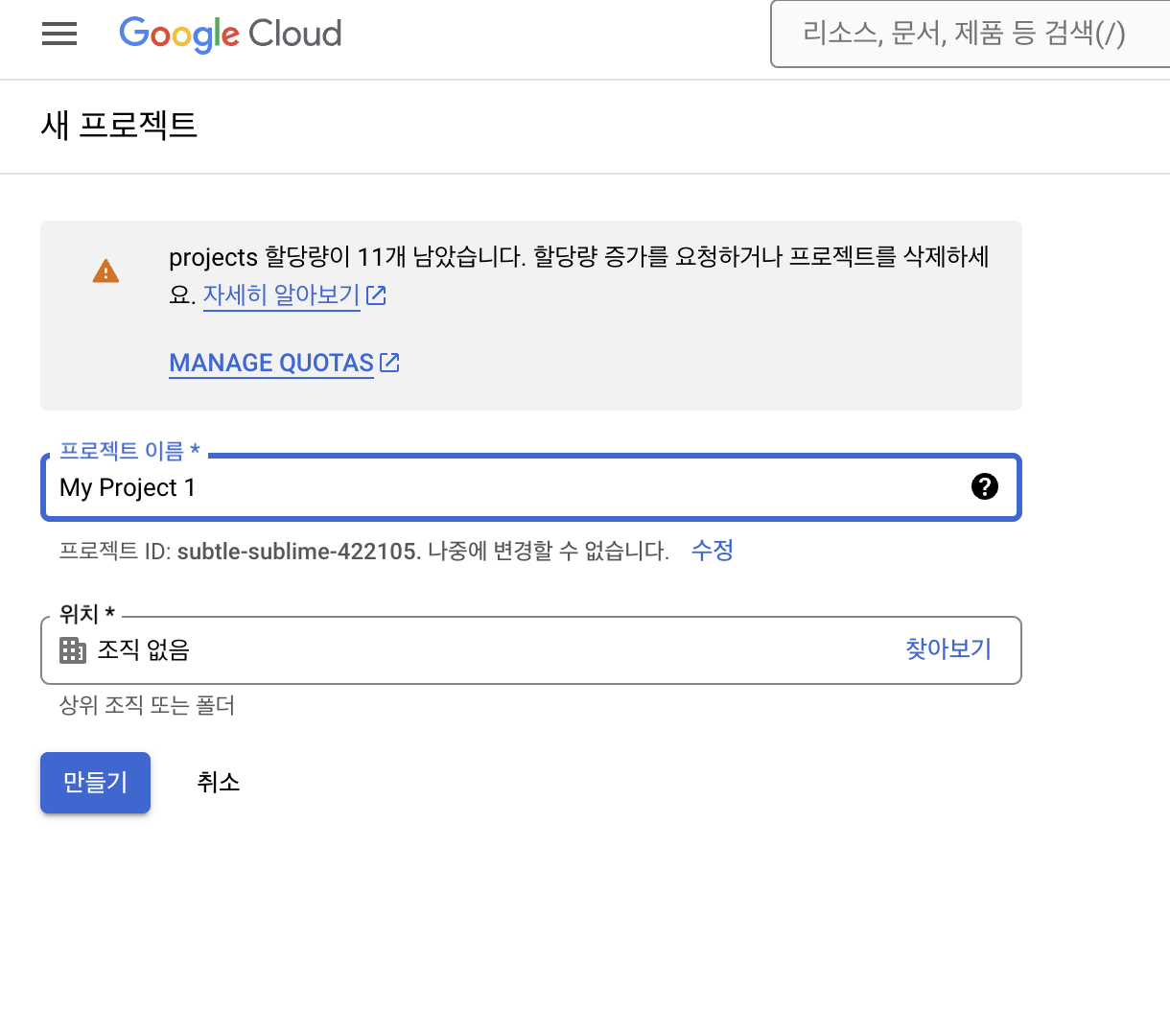 프로젝트 이름 입력 후 만들기 를 클릭합니다.