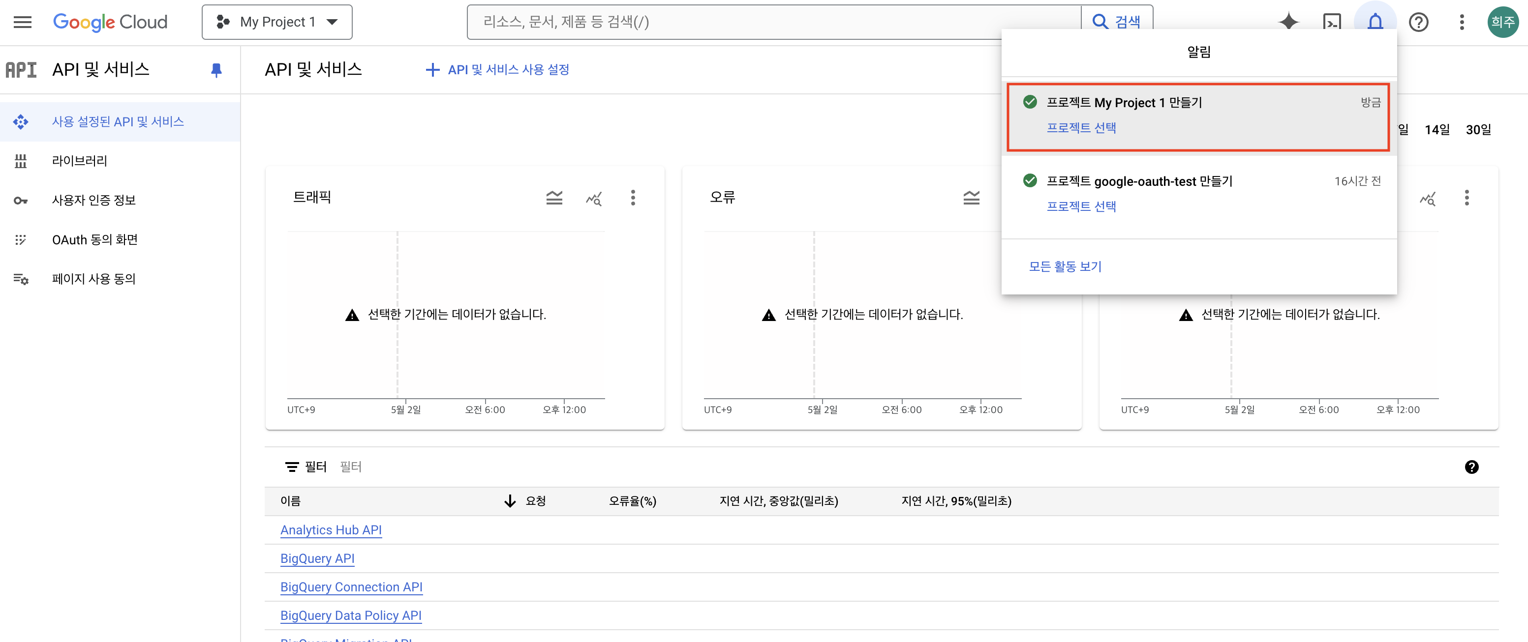 생성이 완료되면 뜨는 오른쪽 상단의 알림창에 프로젝트 선택을 클릭하여 이동합니다.
