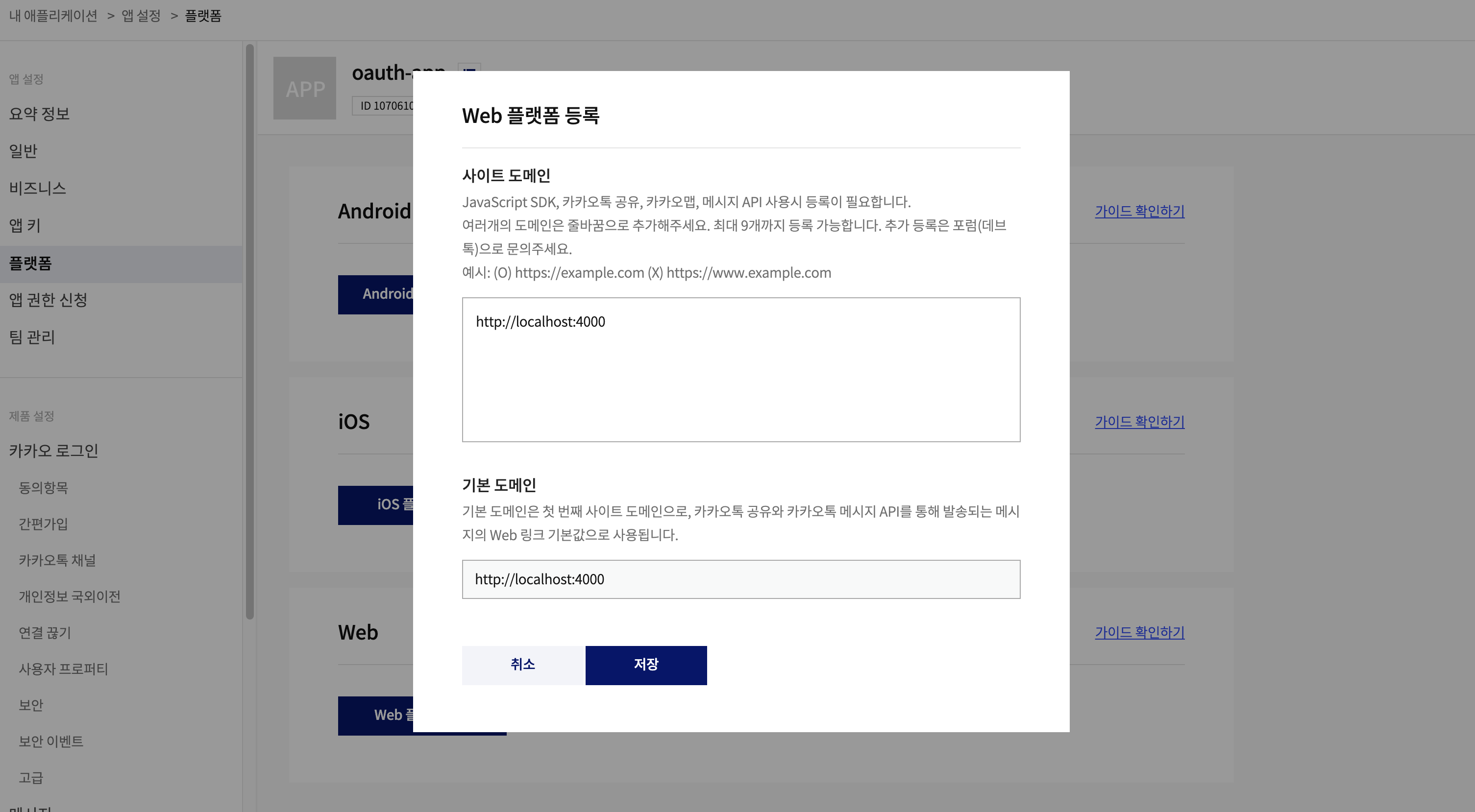 도메인을 등록하기 위해 앱 설정 > 플랫폼 화면으로 이동합니다.