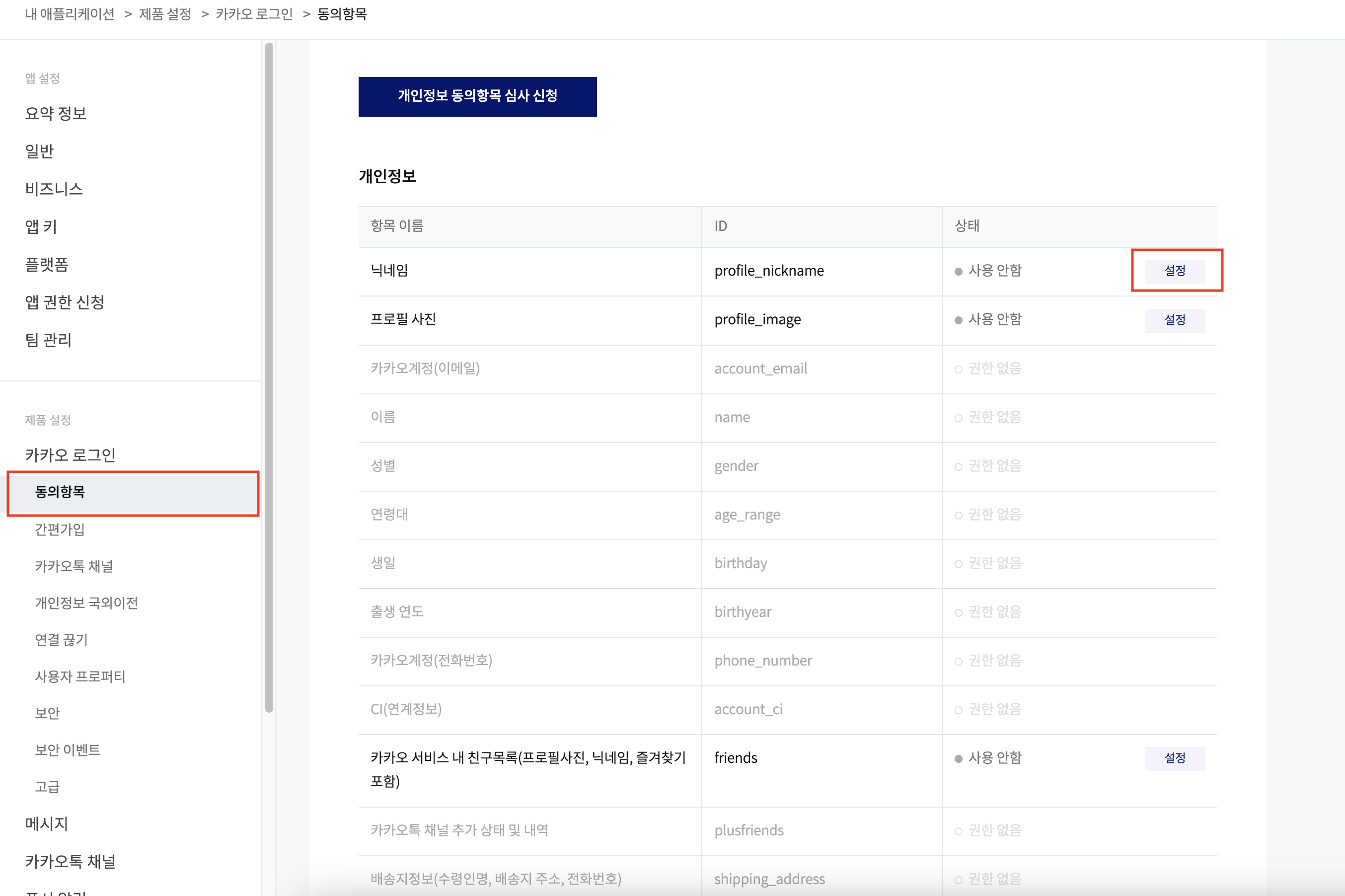 Resource Owner 동의 항목 설정을 위해 제품 설정 > 동의항목 화면으로 이동합니다.