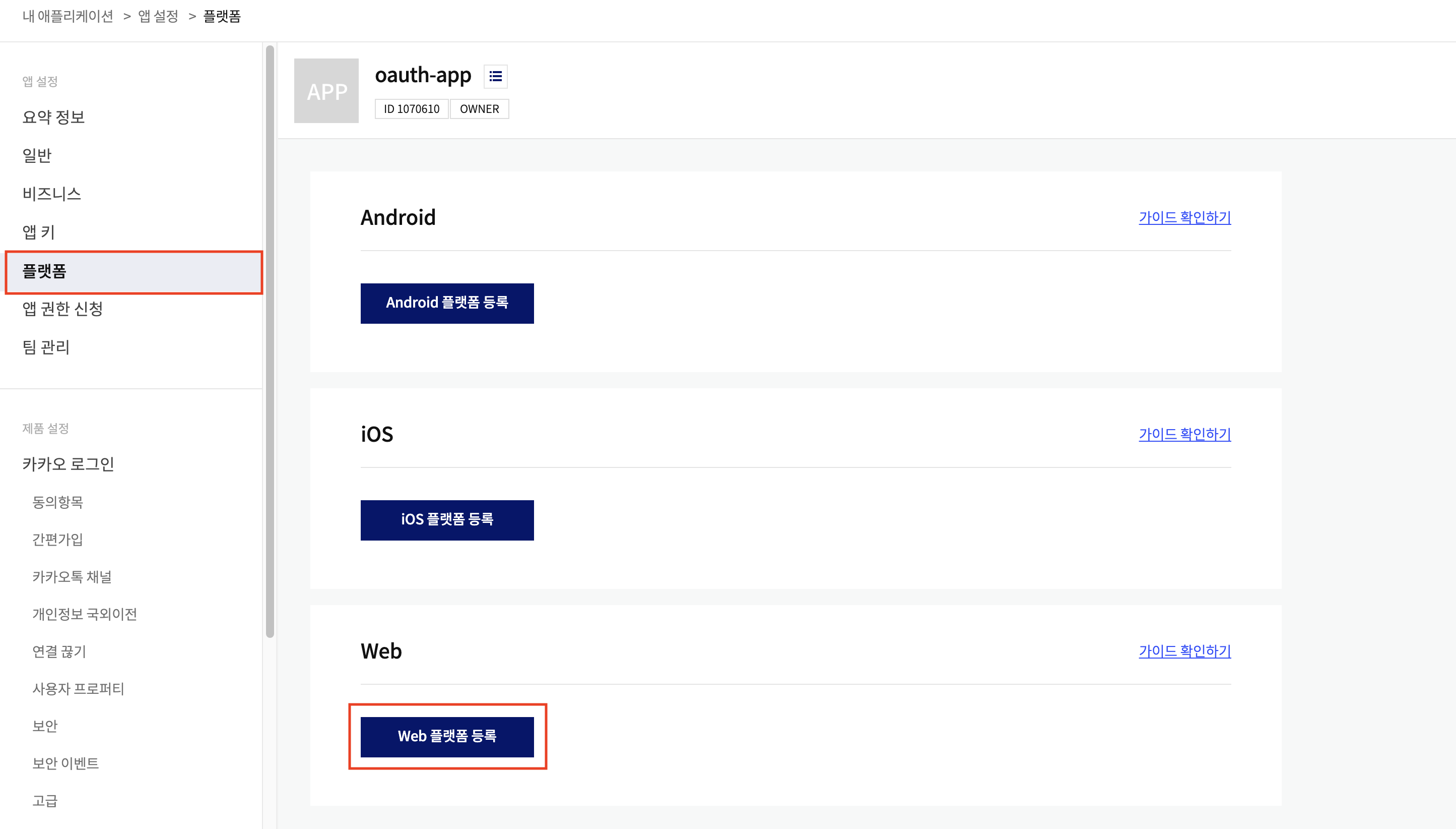 플랫폼 등록을 클릭합니다.