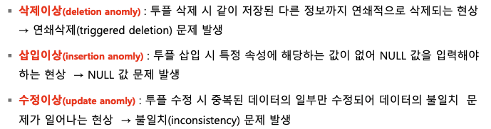 이상현상은 데이터의 일관성을 손상시켜 데이터의 무결성을 깨뜨린다.