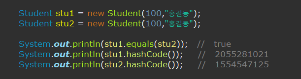 hashCode( ) 는 서로 다른 값이 출력이 되는데 hashCode( ) 도 Override하여