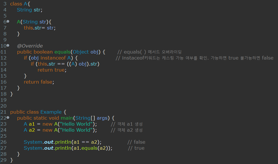위의 예시에서는 A 클래스에서 equals( ) 메서드를 오버라이딩 하였다.