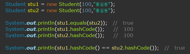 hashCode( ) 가 동일하고 equals( ) 결과가 true이면 같은 객체로 인식한다.
