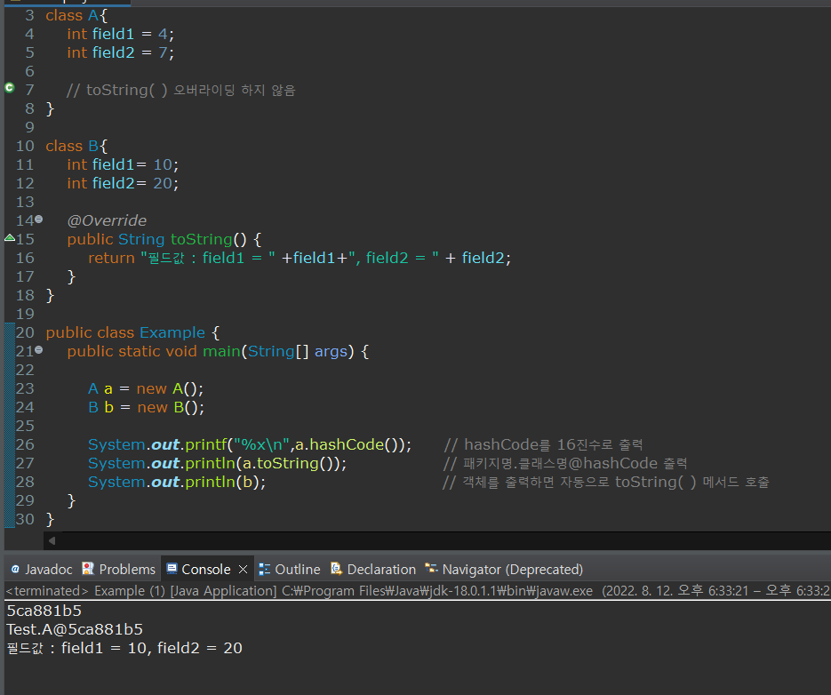 객체 정보를 문자열로 리턴하는 메서드객체 정보는 '패키지명.클래스명@해시코드'로 나타난다.
