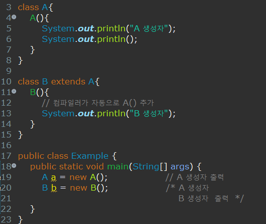 위의 예시에서는 클래스 A의 생성자에 첫줄에는 아무것도 작성되어 있지 않아