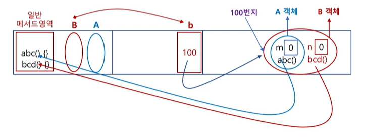 힙 영역에는 실제 객체가 생성될 것이고 참조 변수 b는 B타입으로 선언 되어 있기 때문에 B타입 객체만을 가리킨다.
