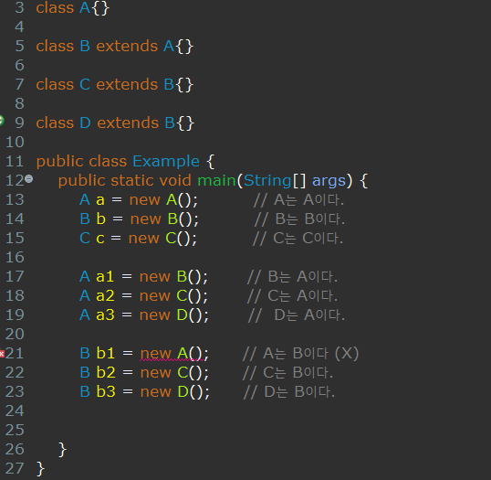 근데 B타입으로 선언되어 있으므로 B객체를 가르켜야 하는데 B객체는 존재하지 않는다. 이것이 오류가 뜨는 이유다.