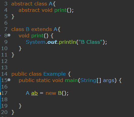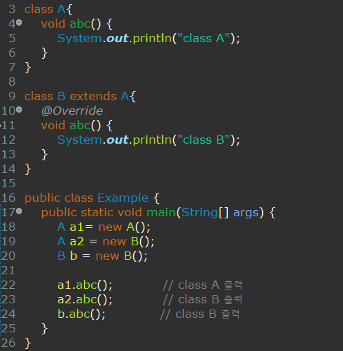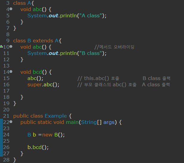 다음과 같이 B클래스는 A클래스를 상속받고 abc( )메서드를 오버라이딩하여