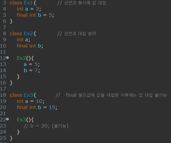 위의 예시에서 8행과 같이 final 필드를 선언하고 생성자에서 값을 대입 할 수도
