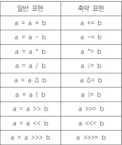 모두 오른쪽의 연산 결과를 왼쪽 변수에 대입하라는 의미이며