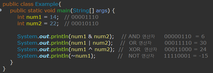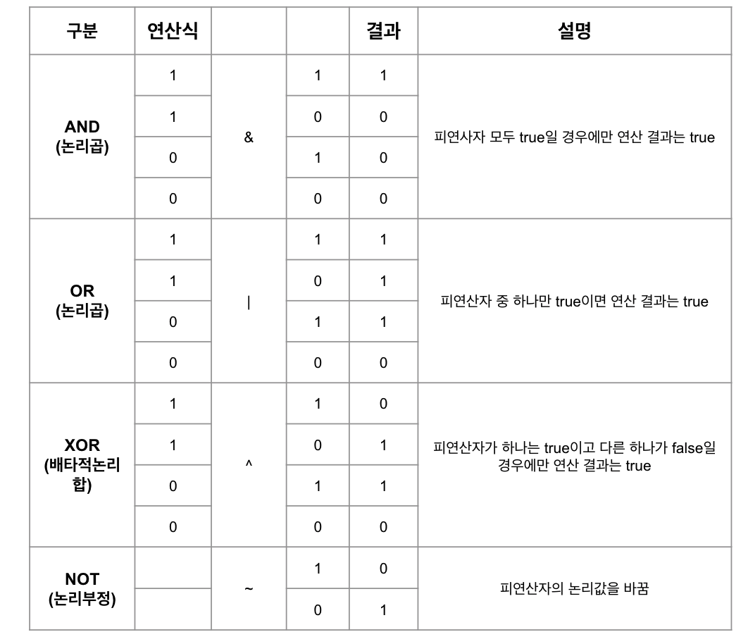일반 논리 연산자 에서는 true 와 false를 연산하지만 비트 논리 연산자에서는 0과 1을 연산한다.