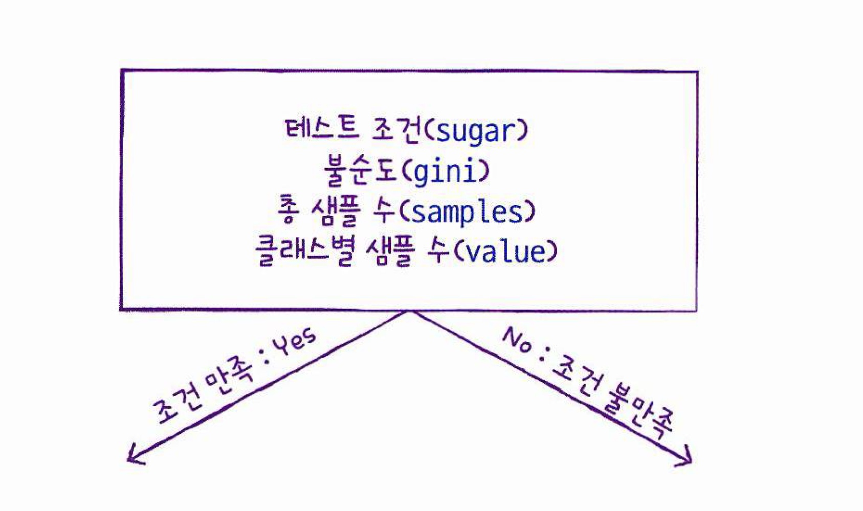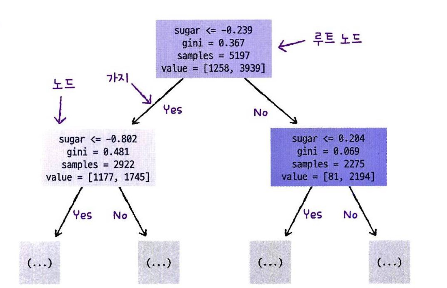 criterion매개변수로 설정 가능(기본값: gini)지니 불순도 = 1 - (음성 클래스 비율^2 + 양성 클래스 비율^2)