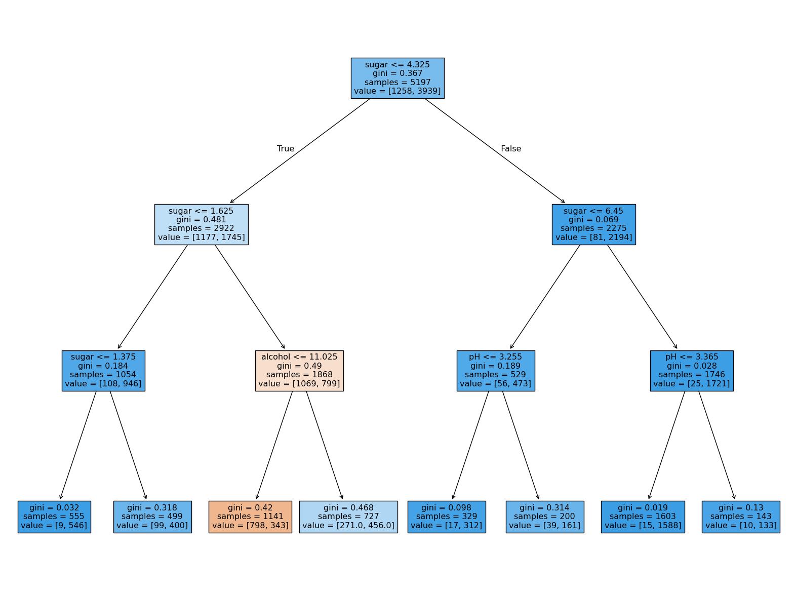 plot_tree(dt, filled=True, feature_names=['alcohol', 'sugar', 'pH'])